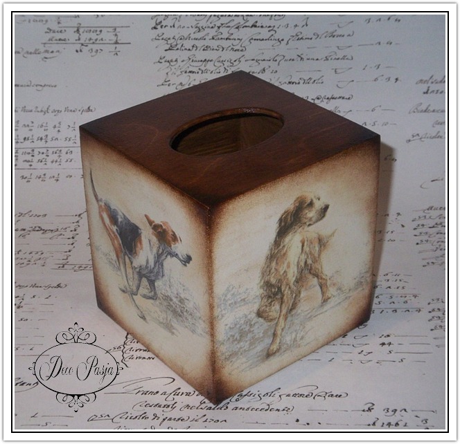 Już odpowiadam…na chusteczniku są pieski z serwetki kupionej na niemieckiej aukcji. Spodobały mi się baaardzo i miałam milion planów z nią związanych, ale ciągle ją odkładałam (taka głupia oszczędność 😉 wiecie jak to jest, prawda? :)) ).