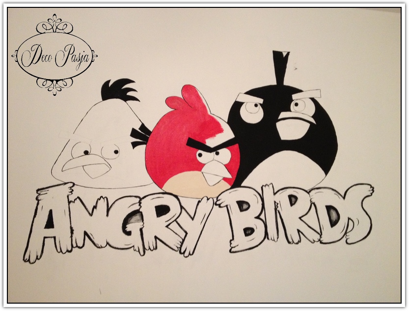 Kupiłam wiaderko białej farby i wzięłam się za robotę cała i rozentuzjazmowana… Mój entuzjazm skończył się dość szybko…nie sądziłam, że dotychczasowy kolor ścian doprowadzi mnie do rozpaczy…to tylko zielony…jak zrobić, żeby było bielusieńko? wiaderko farby skończyło się błyskawicznie…kolejne kolejnego dnia również, i kolejne kolejnego dnia również….trzy dni malowałam, w niedzielę około południa stwierdziłam, że chyba czwarte wiadro farby nie będzie potrzebne… chwyciłam więc ołówek, wydrukowany wcześniej wzór plakatu z Angry Birds i naszkicowałam go na ścianie…