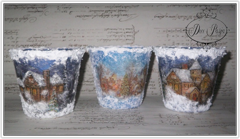 Kilka dni przed ogłoszeniem konkursu “Zimowe światełko” na forum Decoupage24 zakupiłam szkiełka, by zrobić lampiony. Dobrze się złożyło, ja trochę przyspieszyłam z pracami świątecznymi i powstały 3 bajeczne lampioniki z domkami zimą 🙂