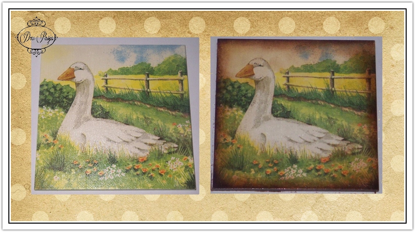 I obrazki, o których wspominałam. Zwykle oklejanki, które również potraktowałam patynką. Zrobiłam im zdjęcia przed i po. Ładne są przed, takie czyste, ale zdecydowanie wolę wersję po.