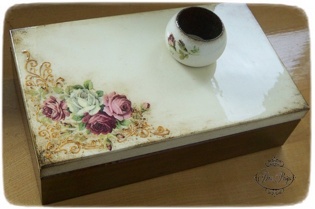 Na wieczku pudełeczka przykleiłam motyw z serwetki, zalakierowałam, stemplem zrobiłam zawijaski, które przejechałam złotą konturówką i pociapałam patyną.