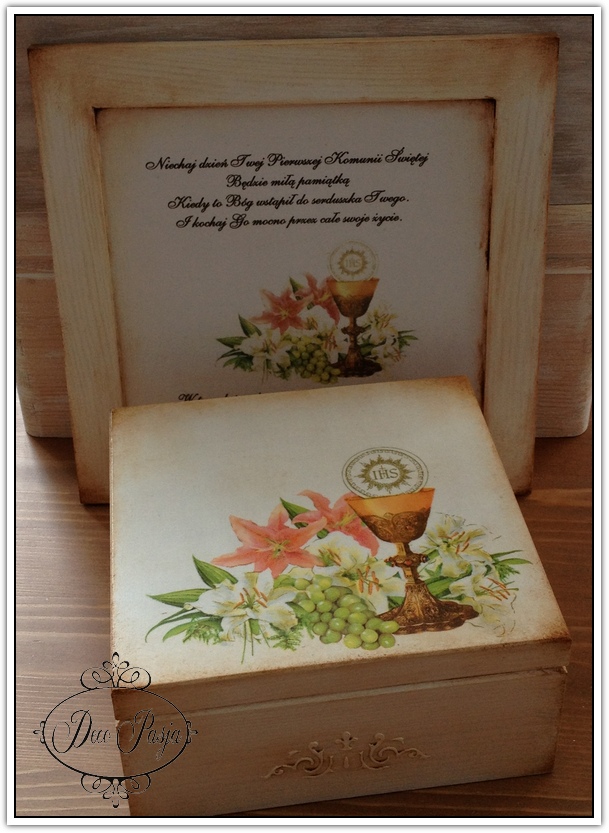 Kolejny komplecik powstał na specjalne zamówienie. Powędrował do dziewczynki jako Pamiątka Pierwszej Komunii Świętej. Pudełeczko i obrazek z dedykacją delikatnie pocieniowane patyną.